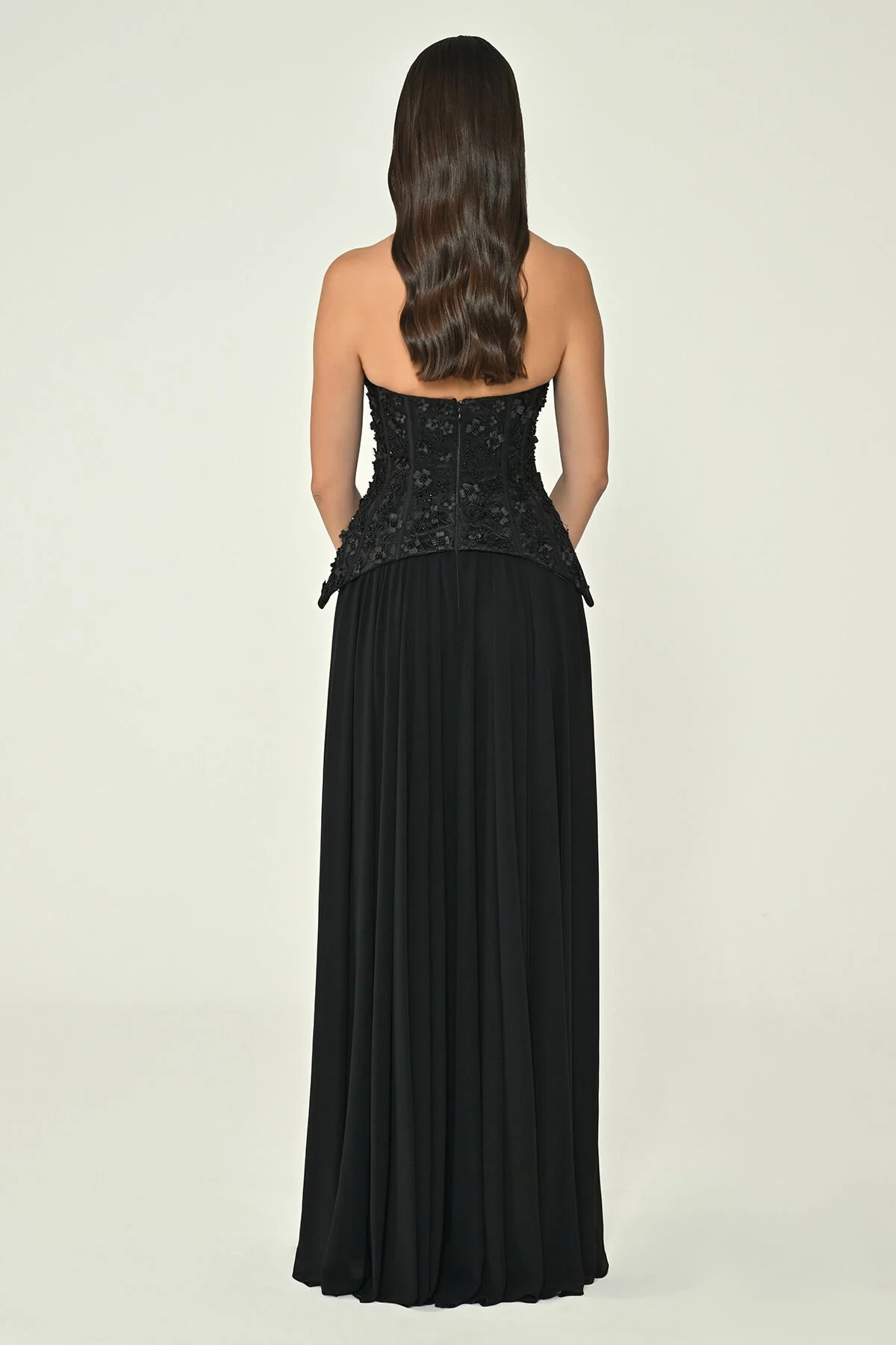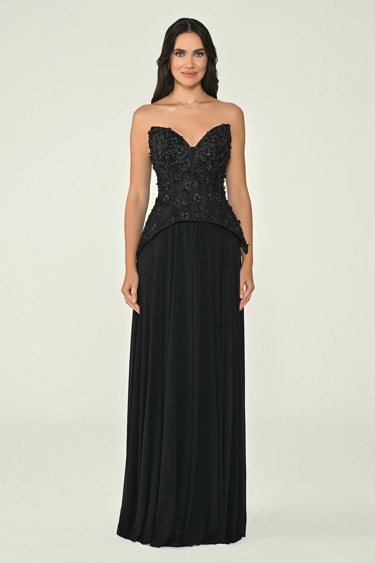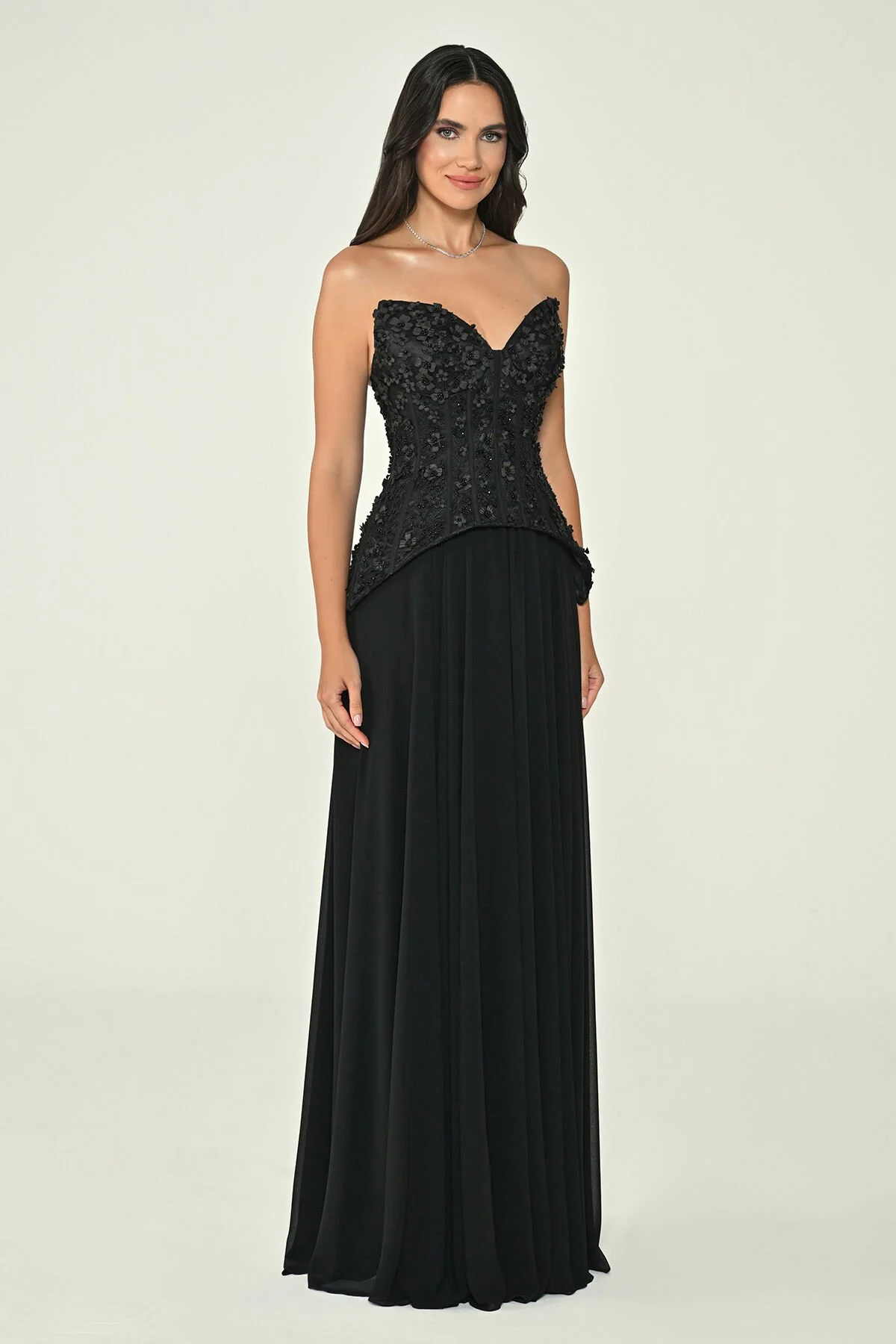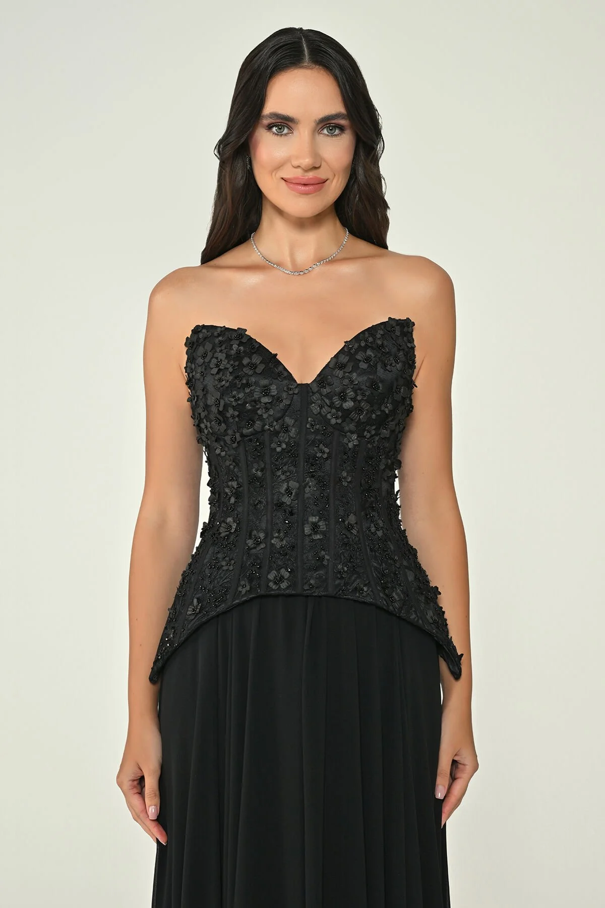 Siyah Straplez Üstü Üç Boyut Çiçekli Şifon Uzun Abiye Elbise 76