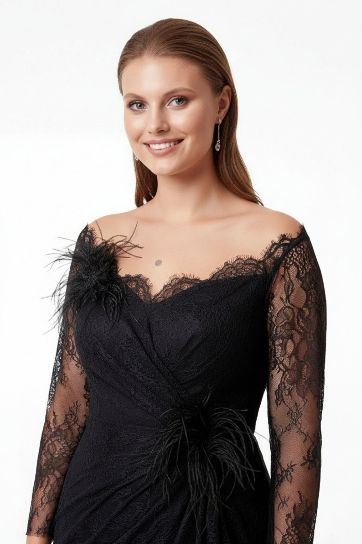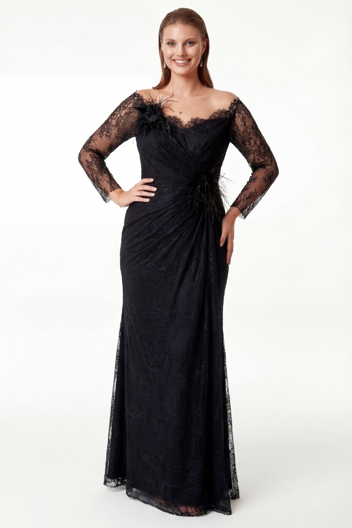 Siyah Uzun Kollu Dantel Otriş Detaylı Drapeli Yıtmaçlı Büyük Beden Abiye Ebise 91