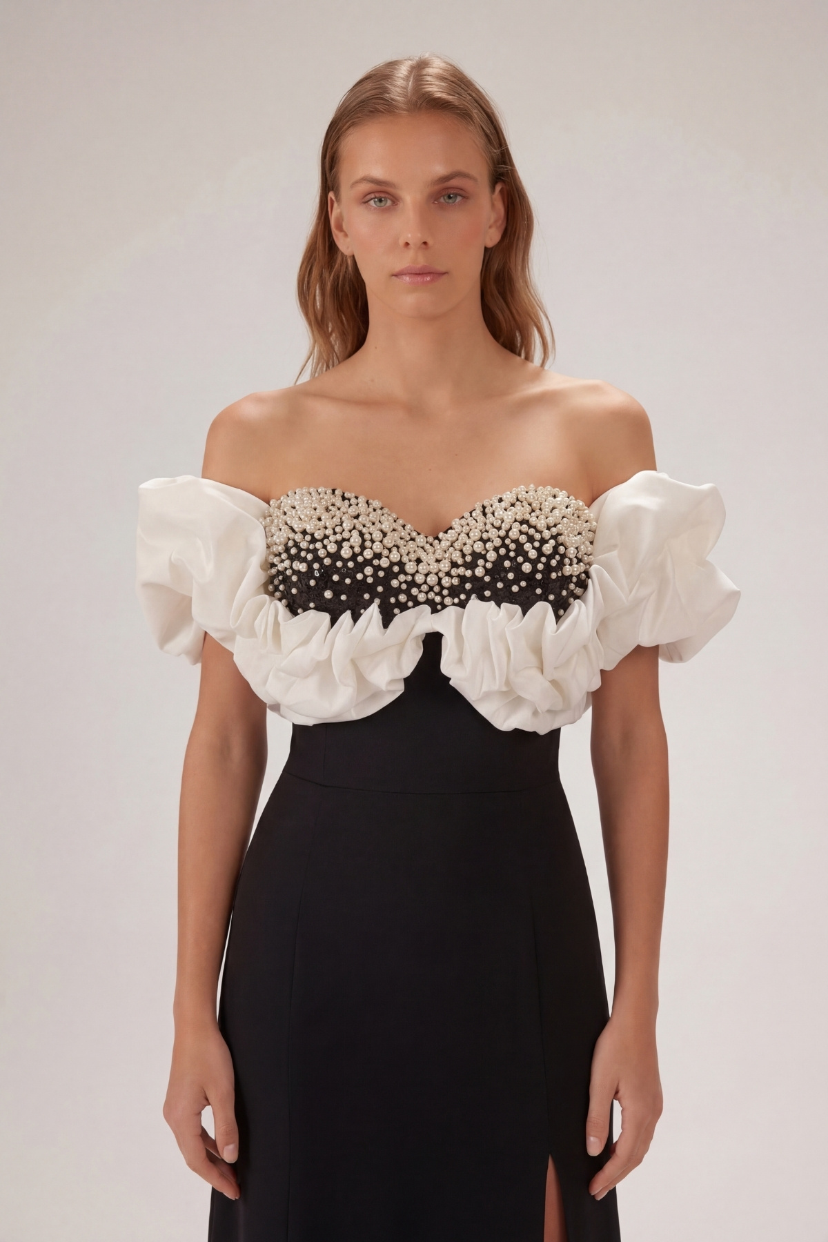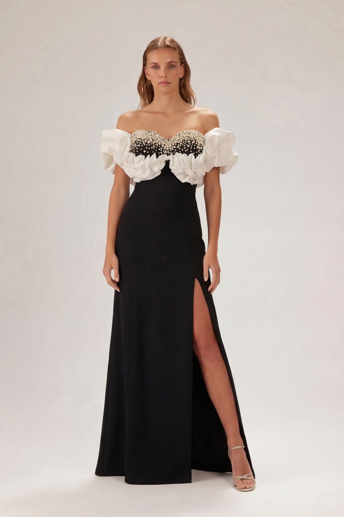 SiyahBeyaz Madonna Yaka Göğüs İncili Yırtmaçlı Büyük Beden Abiye Elbise 61