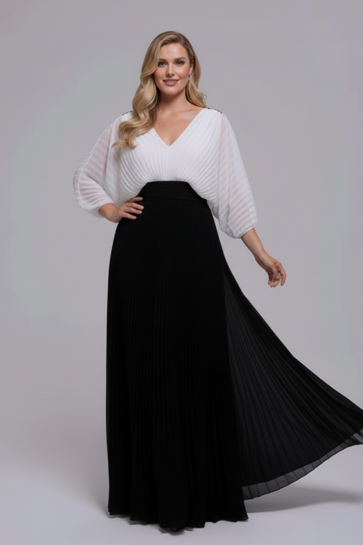SiyahBeyaz Ön Arka V Pliseli Yarasa Kol Şifon Büyük Beden Abiye 64