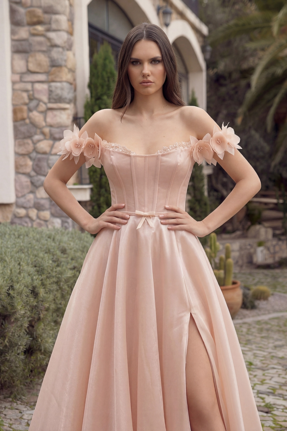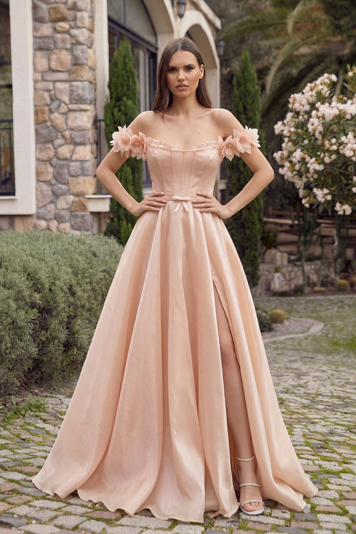 Somon Straplez Göğsü Taşlı Düşük Kol Kollar Çiçekli Abiye Elbise 71