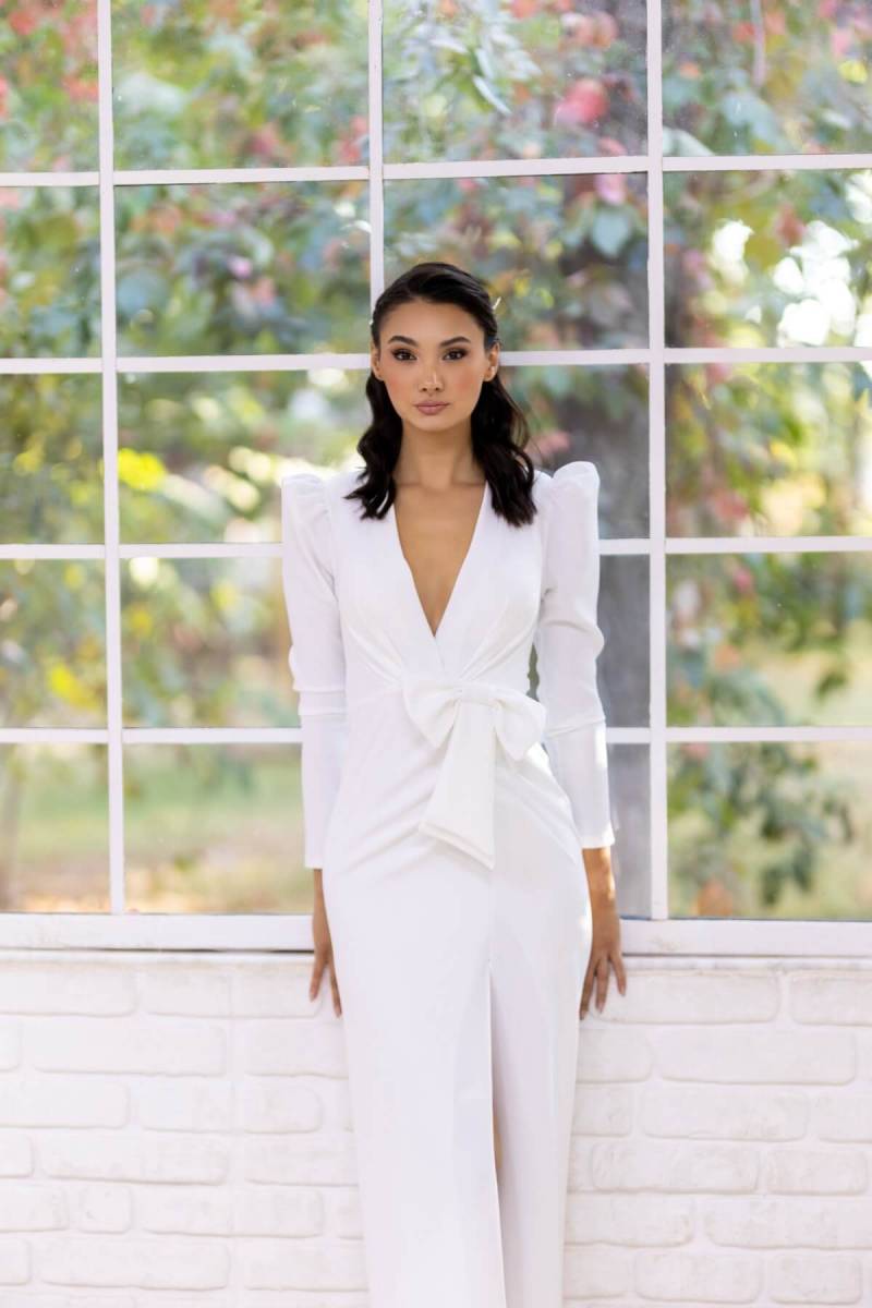 White Deep V Long Sleeve Waist Bow Crepe Midi Evening Dress 25