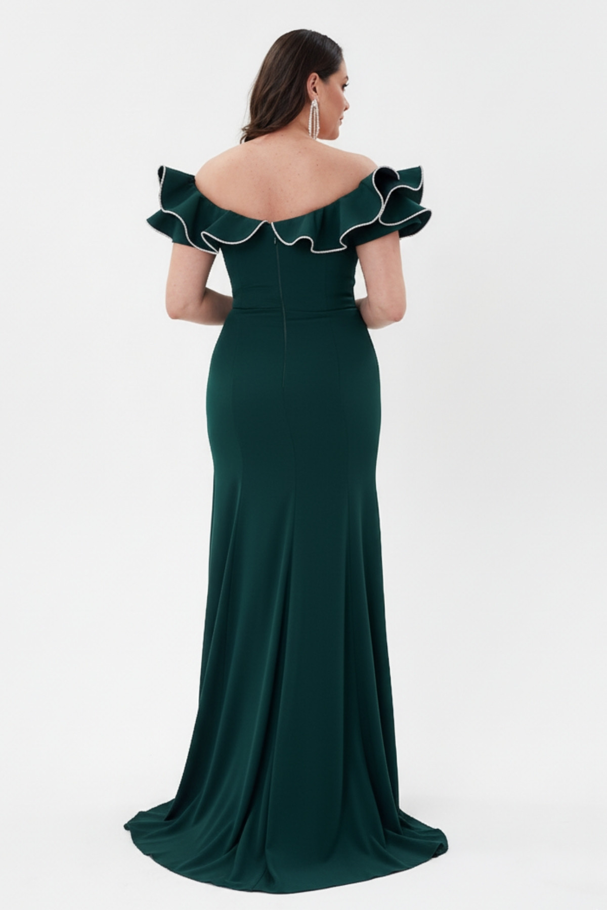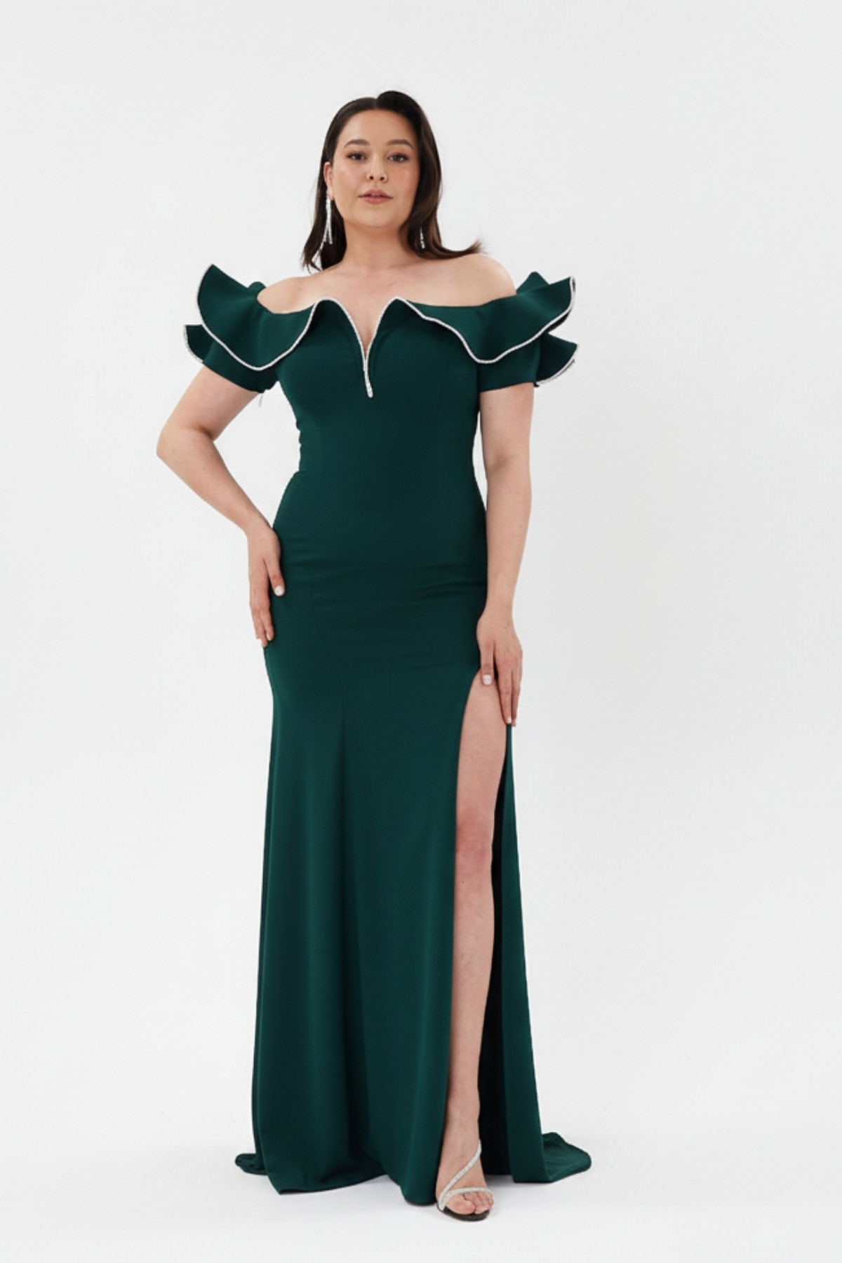 Yeşil Kayık Yaka Volanlı Taşlı Yırtmaçlı Abiye Elbise 79